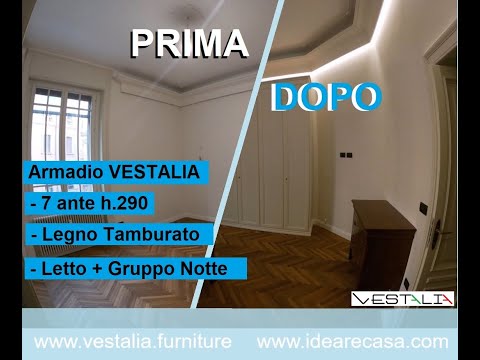 Armadio VESTALIA laccato 7 ante alto 3 metri con Letto e Gruppo Notte. Armadio in Legno Tamburato di Abete in finitura Laccato opaco. Attrezzatura interna completa di : ripiani, tubi. Gruppo notte con letto, comò e comodini. Armadio progettato e realizzato per le specifiche esigenze del cliente.
